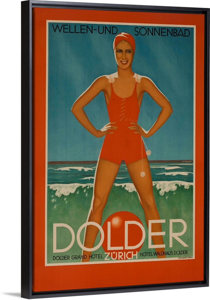 <p>1930s Swiss travel poster, for the Dolder Grand Hotel Zurich. Bathing beauty stands over a beach ball in the waves of Lake Zurich. Wellen-Und Sonnenbad Waves and Sunbathing</p>