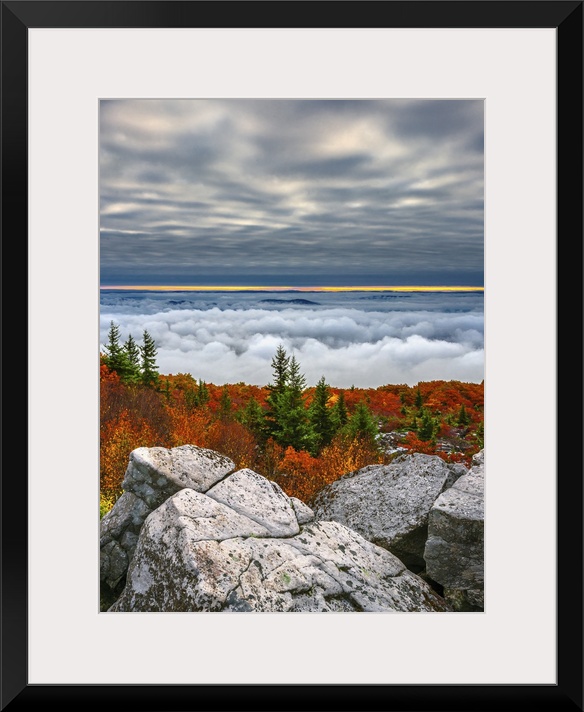 <p>Beautiful Fall color scene from the top of Dolly Sods in West Virginia features both clouds above and clouds below the viewer amidst great boulders, lit orange and green foliage and a streak of rising sunlight at the horizon.</p>