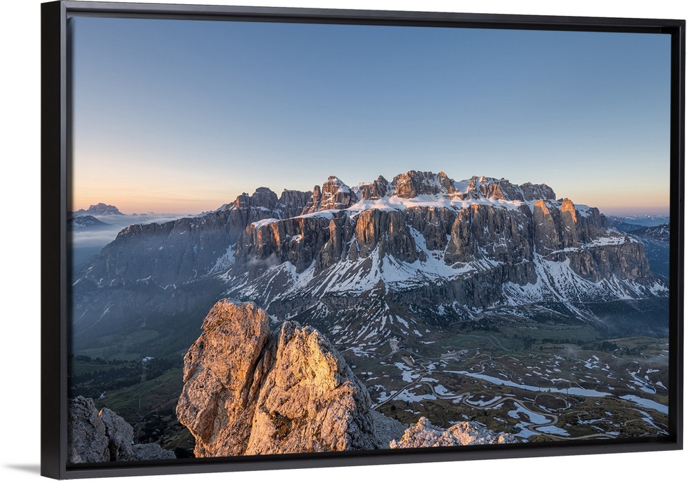 <p>Gran Cir, Gardena Pass, Dolomites, Bolzano district, South Tyrol, Italy, Europe. View at sunrise from the summit of Gran Cir to Sella mountains.</p>