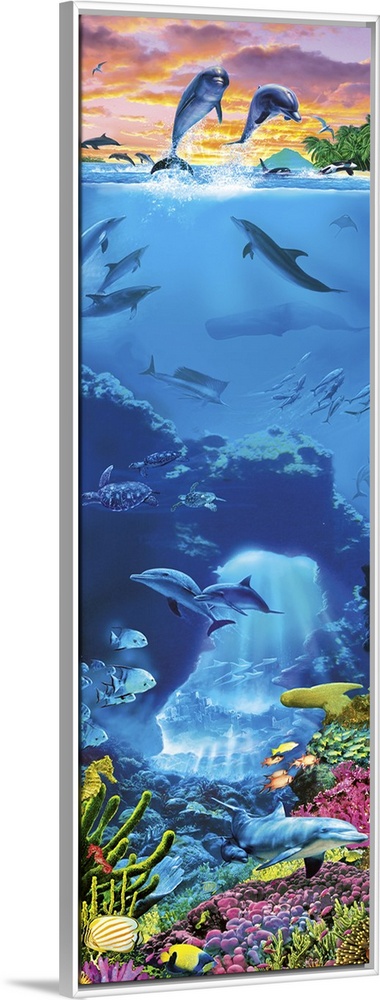 <p>Two Dolphins with a sunset sky leaping out of an underwater scene featuring coral, fish sperm whale, turtles and a marlin plus other dolphind</p>