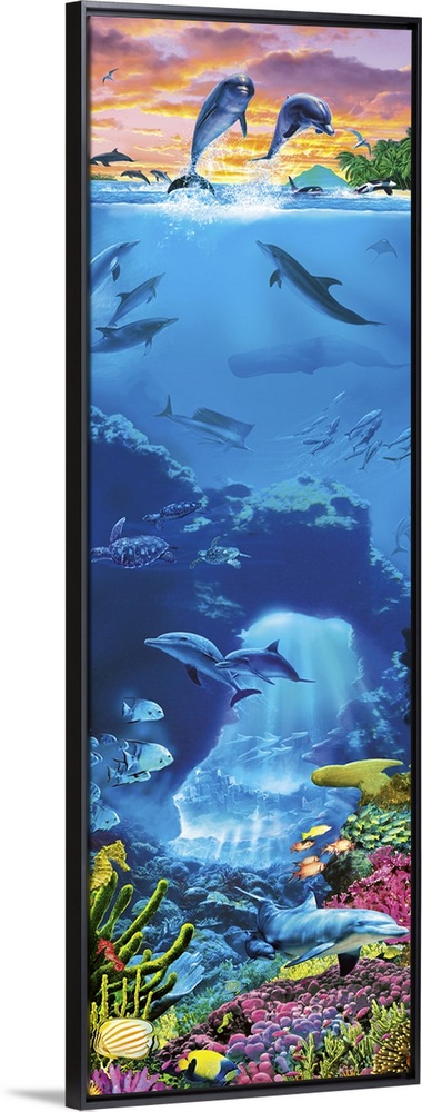 <p>Two Dolphins with a sunset sky leaping out of an underwater scene featuring coral, fish sperm whale, turtles and a marlin plus other dolphind</p>
