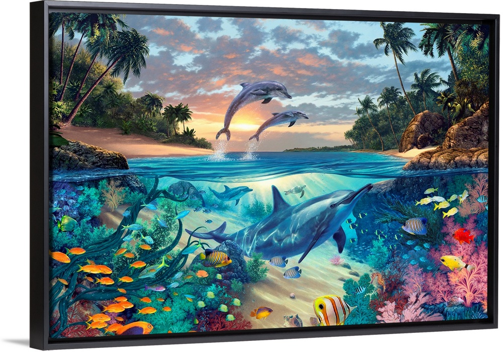 <p>Big fantasy painting on canvas of dolphins swimming underneath the water with other fish and two dolphins jumping out of the water at sunset with a beach and palm trees on either side.</p>