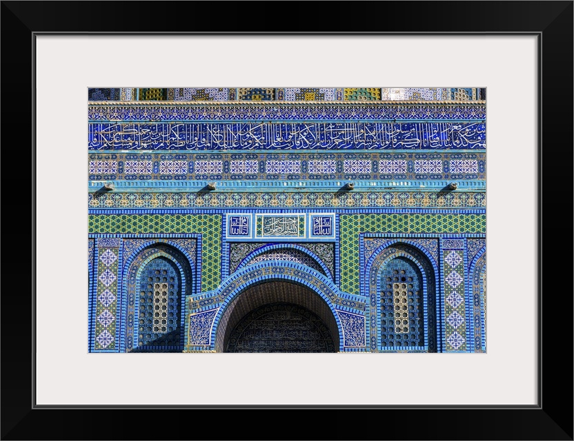 <p>Dome of the Rock Islamic Decorations Mosque Temple Mount Jerusalem Israel. Built in 691 One of most sacred spots in Islam where Prophet Mohamed ascended to heaven on an angel in his ""night journey"". The Dome covers the rock where Abraham was to sacrifice Issac.</p>