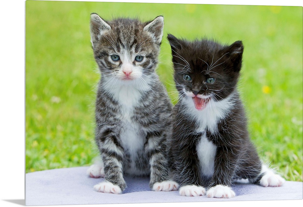 <p>two kittens sitting on cushion on garden lawn, Lower Saxony, Germany, Europe</p>