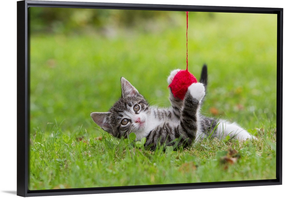 <p>kitten playing with ball of wool in garden, Lower Saxony, Germany, Europe</p>