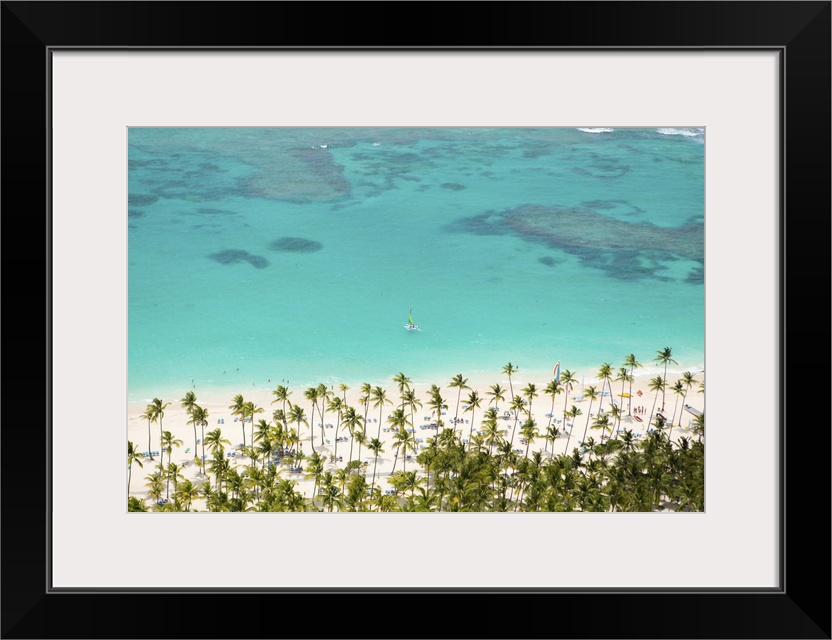 <p>Caribbean, Dominican Republic, La Altagracia province, Punta Cana, Bavaro, aerial view of bavaro beach with a single yacht on the water and a turquoise Caribbean sea</p>