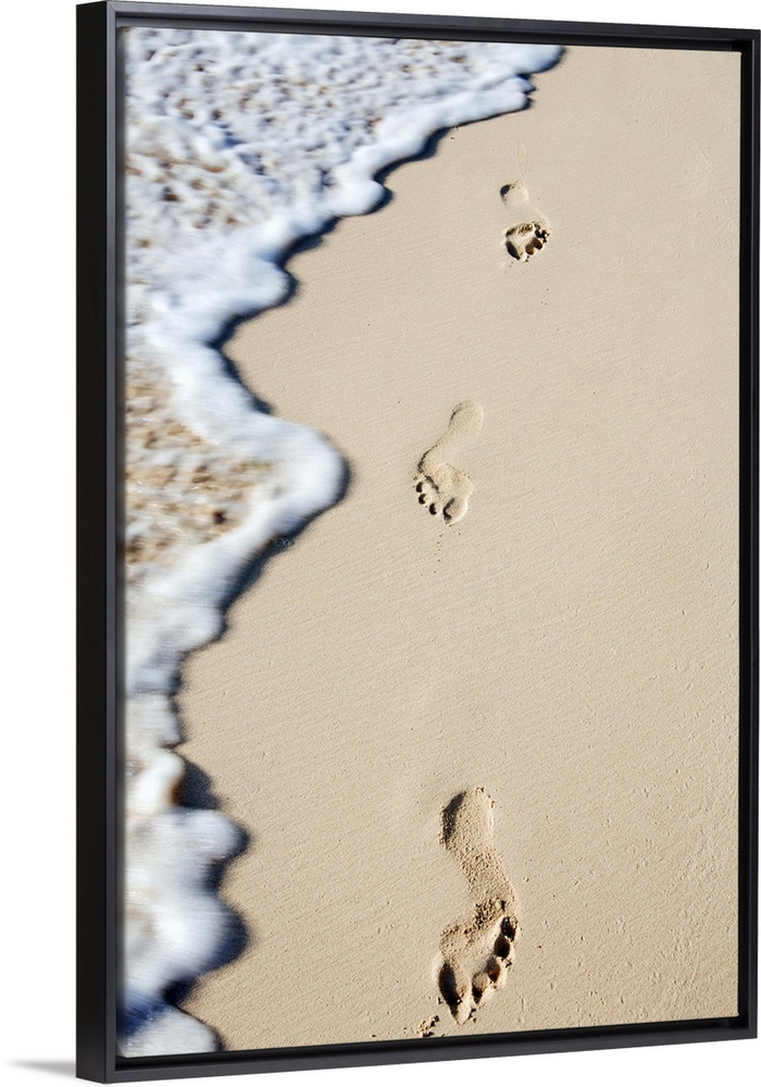 <p>Caribbean, Dominican Republic, La Altagracia province, Punta Cana, Bavaro, footprints in the sand with a breaking wave</p>