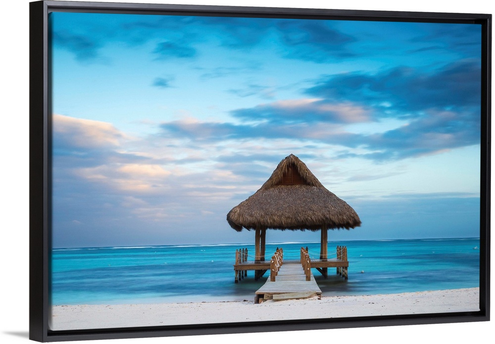 <p>Dominican Republic, Punta Cana, Playa Blanca, Wooden pier with thatched hut.</p>