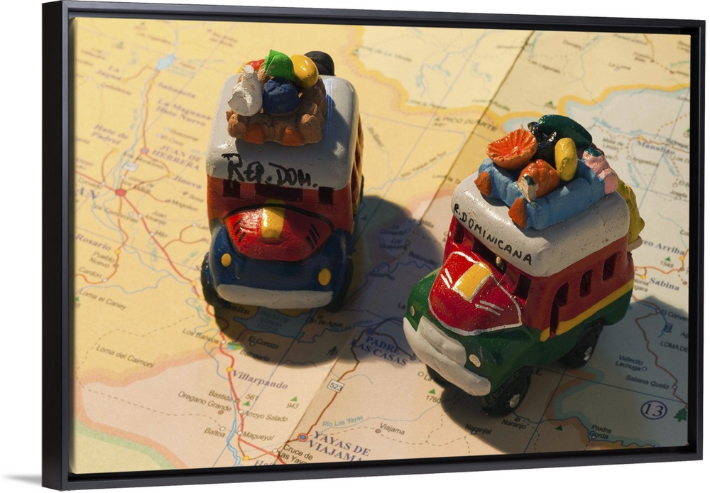 <p>Dominican Republic, Punta Cana Region, Bavaro, toy busses on Dominican map</p>