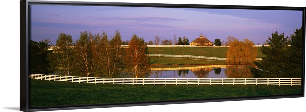 <p>Panoramic photograph of a horse farm and pond in Kentucky available as wall art for the home or office.</p>