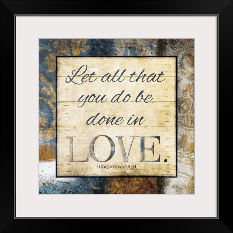 <p>Typography art of the Bible verse 1 Corinthians 16:14 framed with classic style gold and blue flourishes.</p>