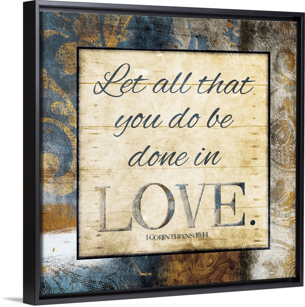 <p>Typography art of the Bible verse 1 Corinthians 16:14 framed with classic style gold and blue flourishes.</p>