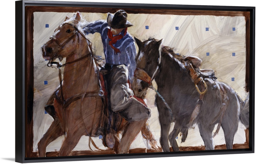 <p>Contemporary western theme painting of a cowboy on horseback, lassoing another horse.</p>
