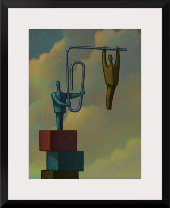 <p>Conceptual painting of a figure strung out on the end of a bent paper clip.</p>
