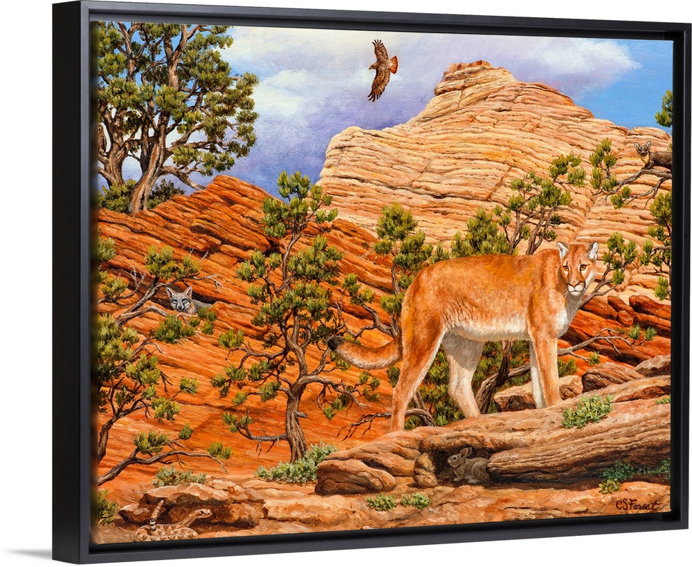 <p>Hawk, coyote hiding and lion on rocks, dessert</p>