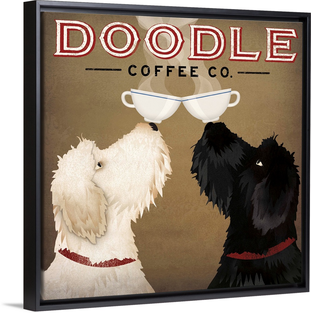 <p>Artwork of black and white goldendoodle dogs balancing cups of coffee on their noses.</p>