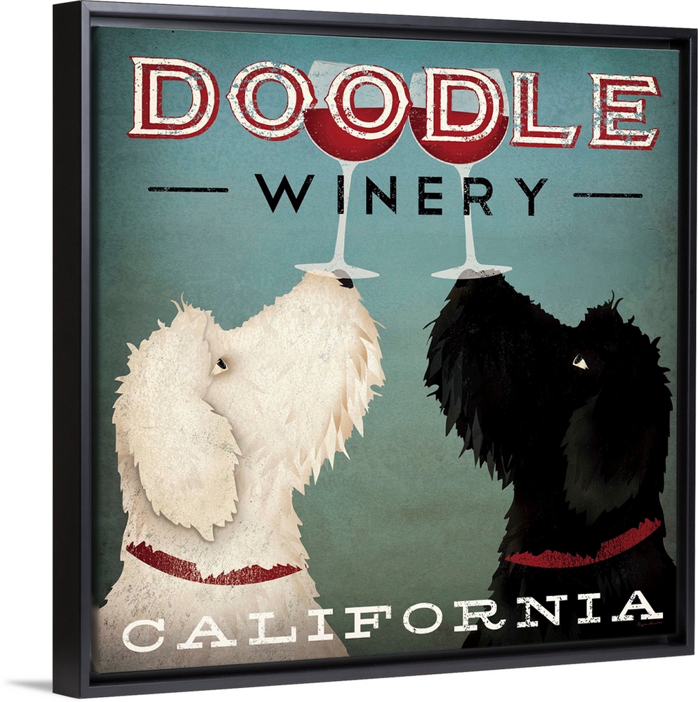 <p>Artwork of Labradoodles balancing glasses of red wine on their noses in unison like a couple of book ends.</p>