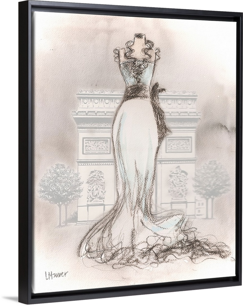 <p>Watercolor painting of a white dress on a dress form, in front of the Arc de Triomphe.</p>