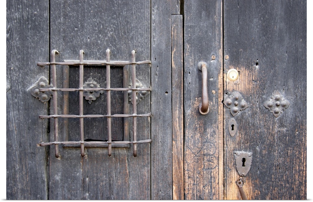 <p>Oversized, horizontal close up photograph of an old wooden door with elaborate safe opening and decorative metal fixtures.</p>