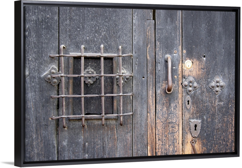 <p>Oversized, horizontal close up photograph of an old wooden door with elaborate safe opening and decorative metal fixtures.</p>
