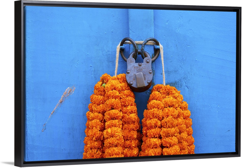 <p>Door, padlock and flower garlands, Kolkata (Calcutta), West Bengal, India, Asia.</p>