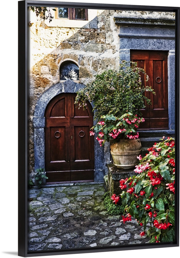 <p>Two wooden doors in a stone wall surrounded by blooming potted flowers.</p>