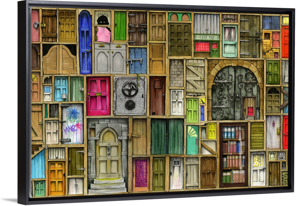 <p>A whimsical and very finely-detailed illustration of dozens of different style doors making up a collage.</p>