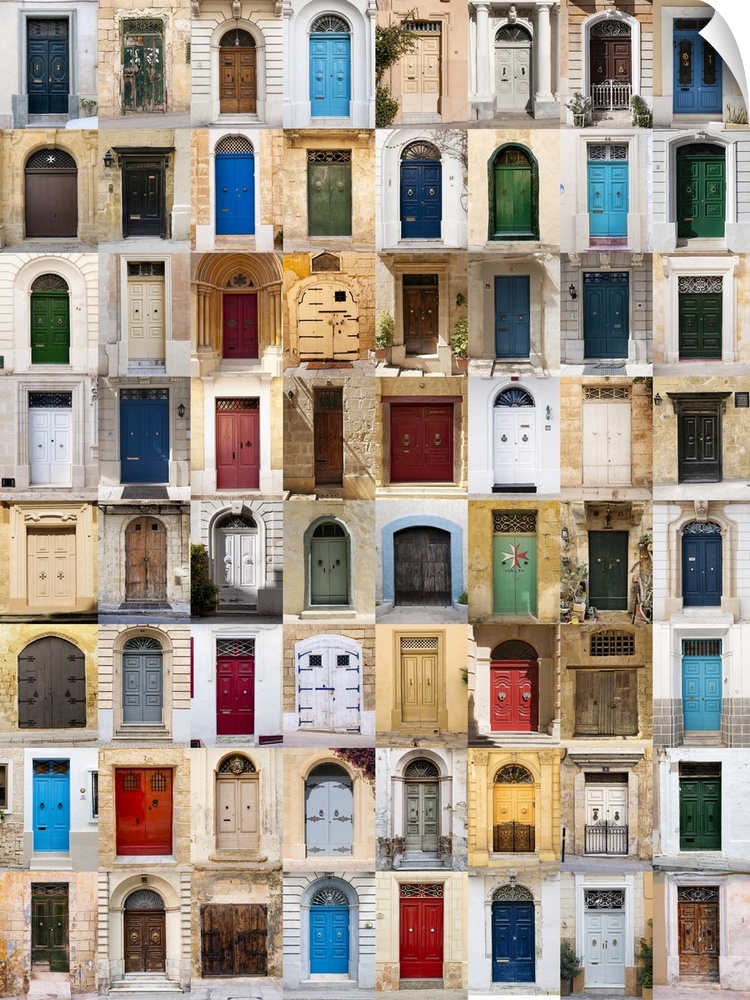 <p>A photo collage of 64 colorful front doors to houses from Malta.</p>