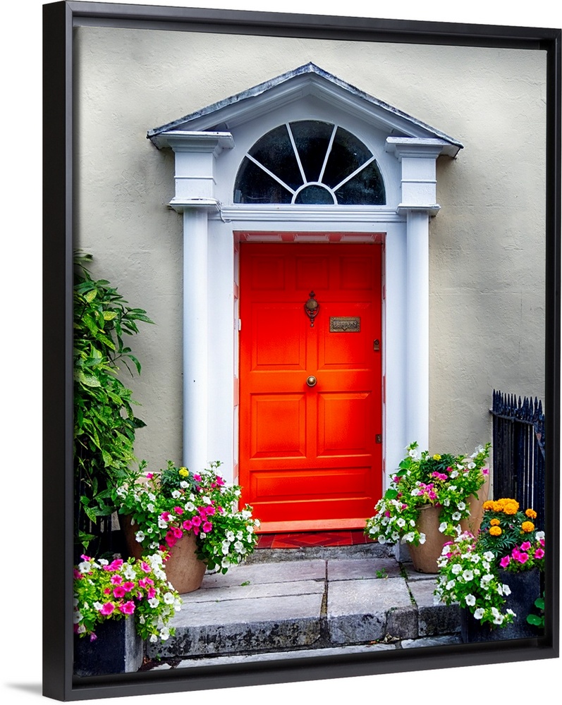 <p>Colorful antique entry door with potted flowers, Cork, Ireland.</p>