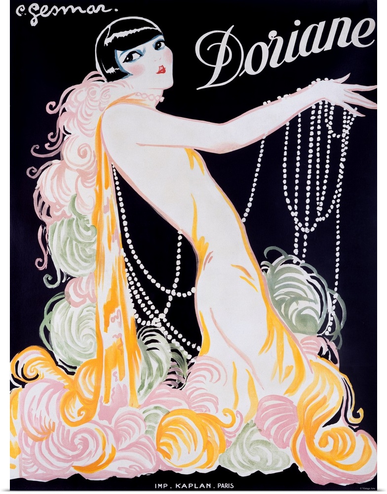 <p>1926 Singer Doriane intrigues us with the mystery of her dark eyes. A rare work by Gesmar for a relatively obscure performer: the singer Doriane (Paule Dorian). Gesmar dazzles us with the opulence of her costume and the strands of pearls, intrigues us with the mystery of her dark eyes and places her against a black background which gives her a spotlit look. Although the poster is undated, the bobbed hair, which became popular in 1926, pinpoints it fairly accurately. Doriane was appearing that season and the next at La Cigale; this was probably the high point of her career, which seems to have started at La Mesange in the early 1920s and ended toward the end of the decade at L'Olympia.</p>