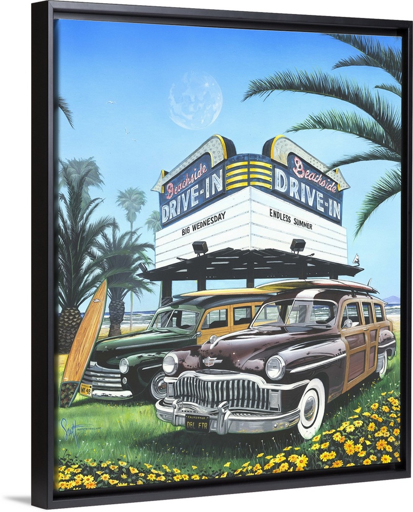His clearly recognizable images of Hawaii beaches and flowers go alongside iconic surfing art featuring woodie cars, flip flops, surfboards and whimsical dogs.