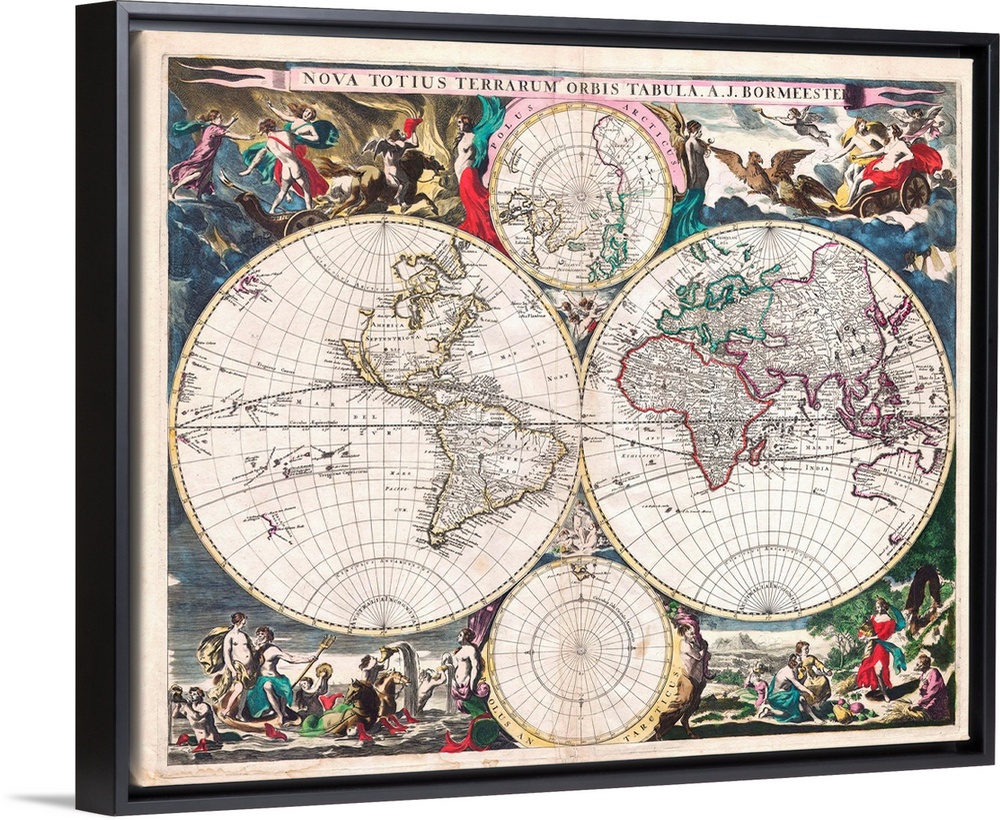 <p>1685 double-hemisphere world map by Joachim Bormeester (Nova Totius Terrarum Orbis Tabula), 22 x 20 in (55.9 x 50.8 cm), hand-colored engraving, private collection.</p>