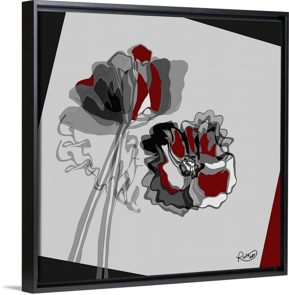 <p>Square abstract painting of red, gray, black, and white flowers created using sections of color.</p>