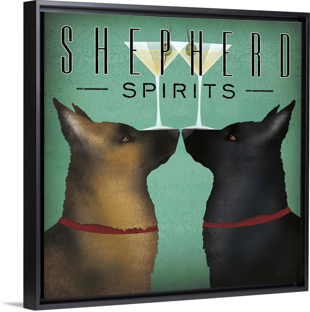 <p>Square illustration of two shepherd dogs balancing martinis on their noses with "Shepherd Spirits" written at the top.</p>