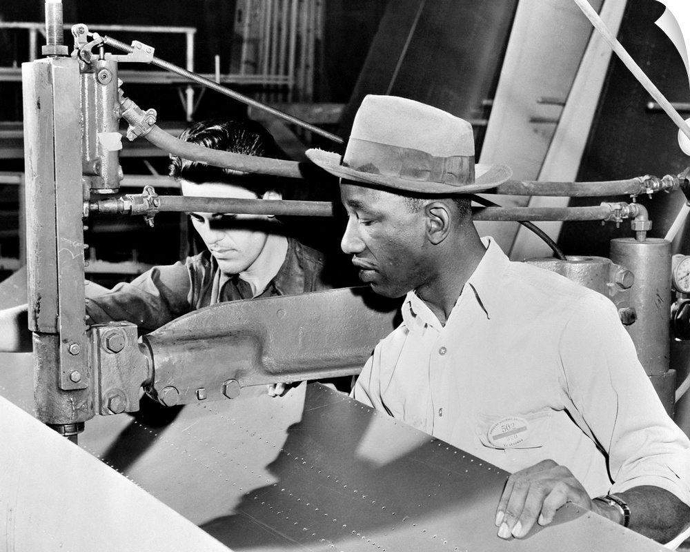 <p>An African-American and Asian-American at work at the Douglas Aircraft factory in Los Angeles, California, during World War II.</p>