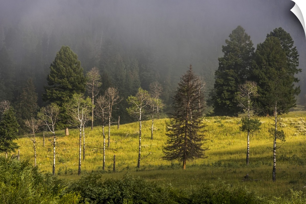 <p>Douglas fir (Pseudotsuga menziesii) and aspen trees (Populas tremuloides) in morning fog in Yellowstone National Park United States of America</p>