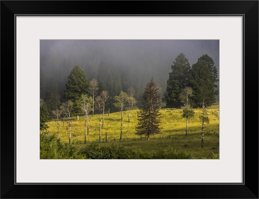 <p>Douglas fir (Pseudotsuga menziesii) and aspen trees (Populas tremuloides) in morning fog in Yellowstone National Park United States of America</p>