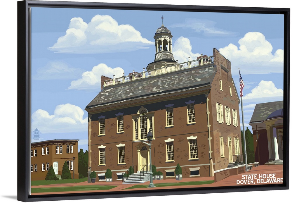 <p>Retro stylized art poster of an old brick building in a historic town.</p>