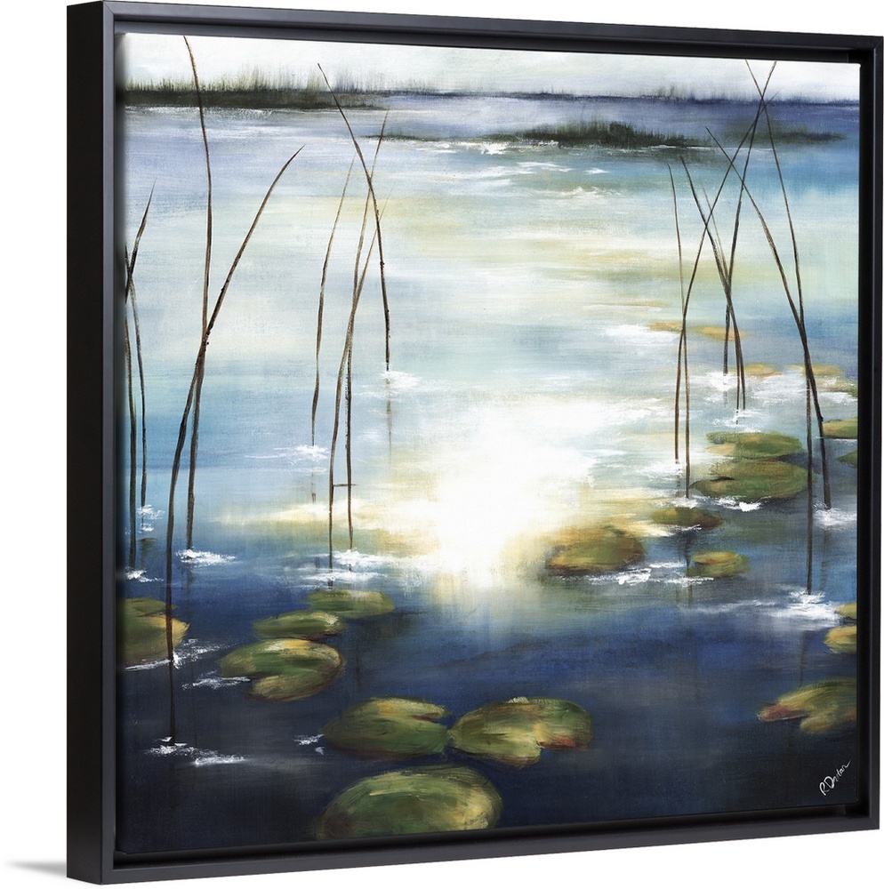 <p>Contemporary painting of lily pads in a pond with the sun reflecting on the water.</p>
