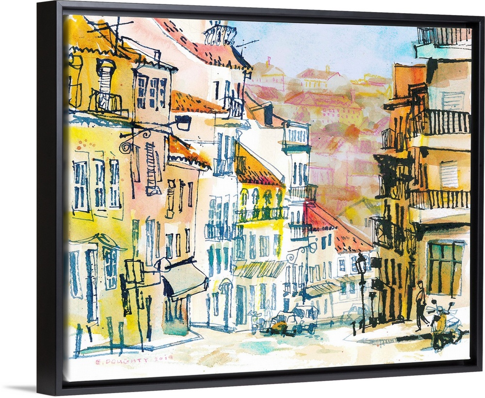 <p>A typical city view in the Portuguese capitol, Lisbon. White & yellow faades and terracotta rooftops are quintessential architecture of the region. The artist rendered this scene in the Bairro Alto neighborhood in ink, watercolor, and watersoluble pencils.</p>