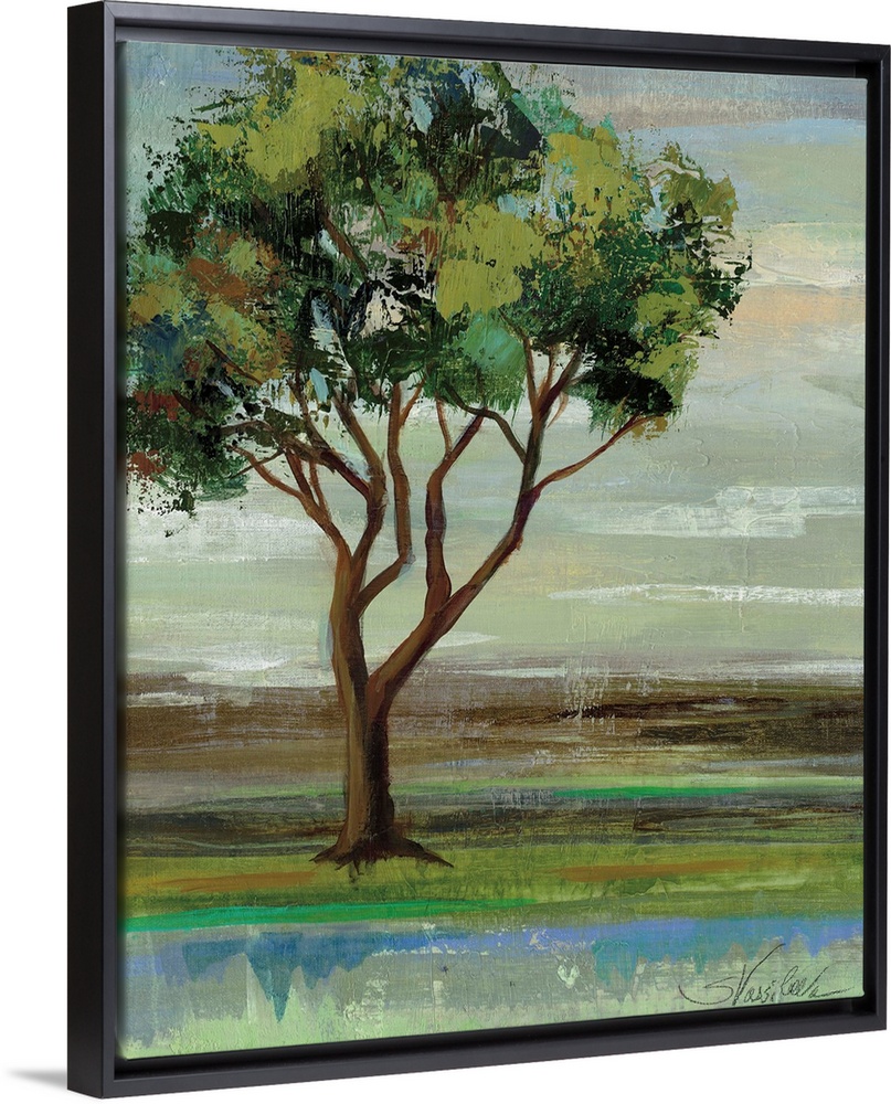<p>Contemporary artwork of a tree with leafy green branches in a field.</p>