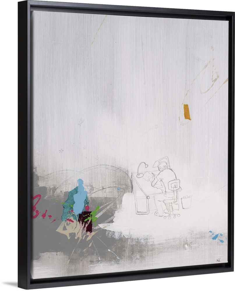 <p>Contemporary abstract painting with hints of color against a neutral background, with a pencil sketch of a man a drawing table in the middle.</p>
