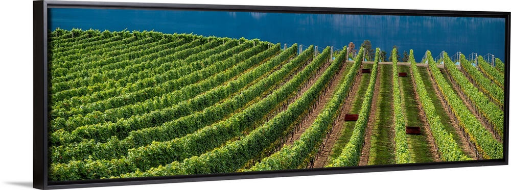 <p>Straight rows of grape vines leading down to Okanagan Lake, Canada.</p>