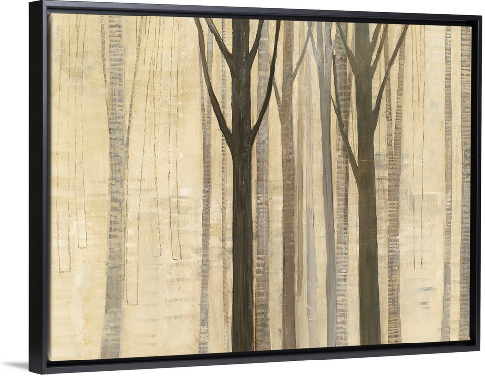<p>Painting of tall trees in a forest in neutral tones.</p>