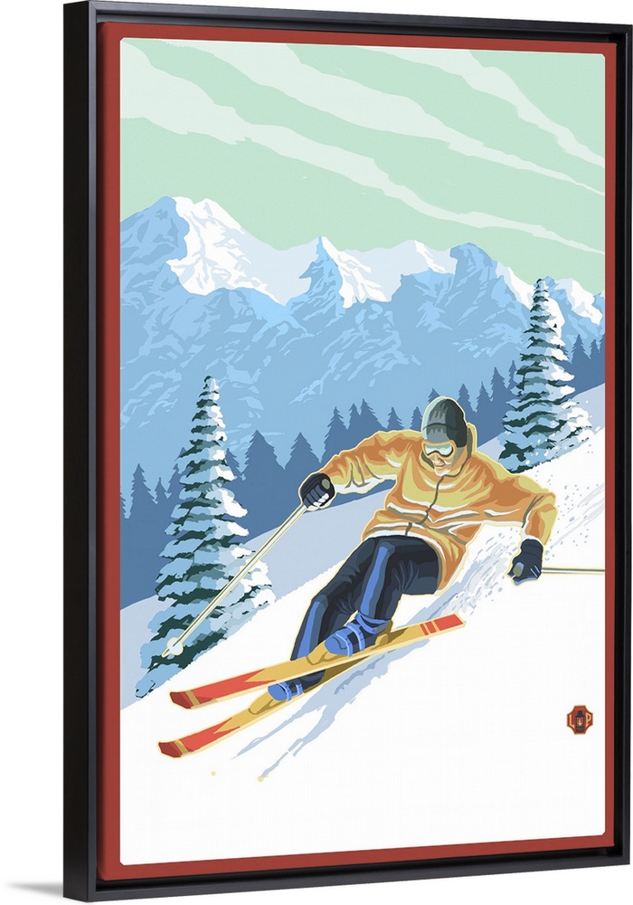 <p>Retro stylized art poster of a downhill skier, with a mountain range in the background.</p>