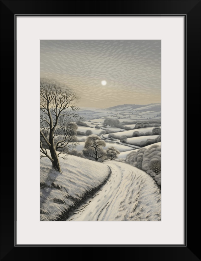 <p>Footprints in the snow on a path on the Downs in West Sussex, England, UK. The moonlight illuminates the countryside during winter.</p>