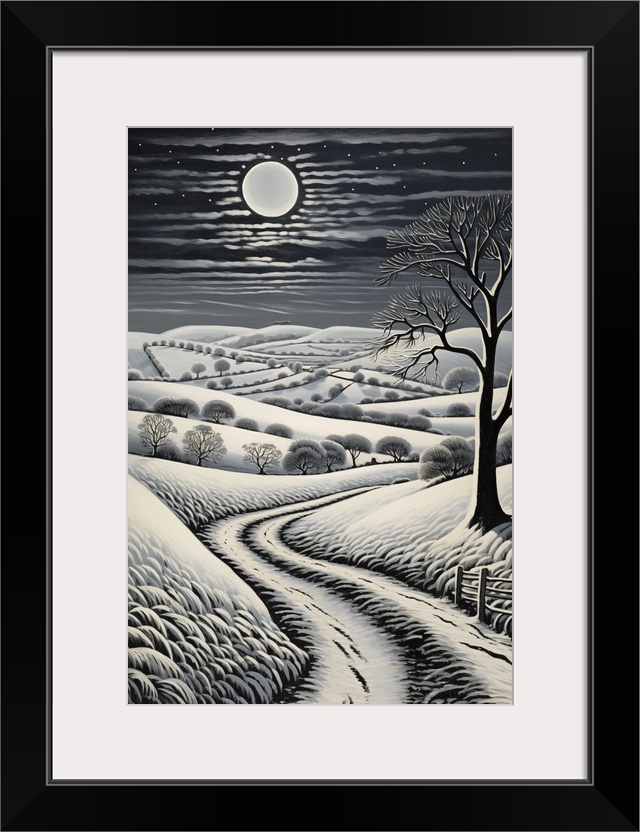 <p>Footprints in the snow on a path on the Downs in West Sussex, England, UK. The moonlight illuminates the countryside during winter.</p>