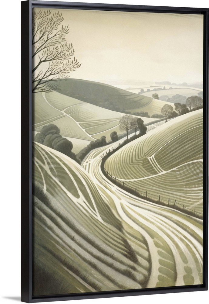 <p>White chalk paths cross fields on the South Downs in southern England.</p>