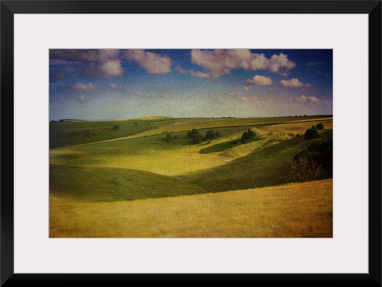 <p>Landscape of the South Downs in southern England with long grass and fields on a summer's day.</p>