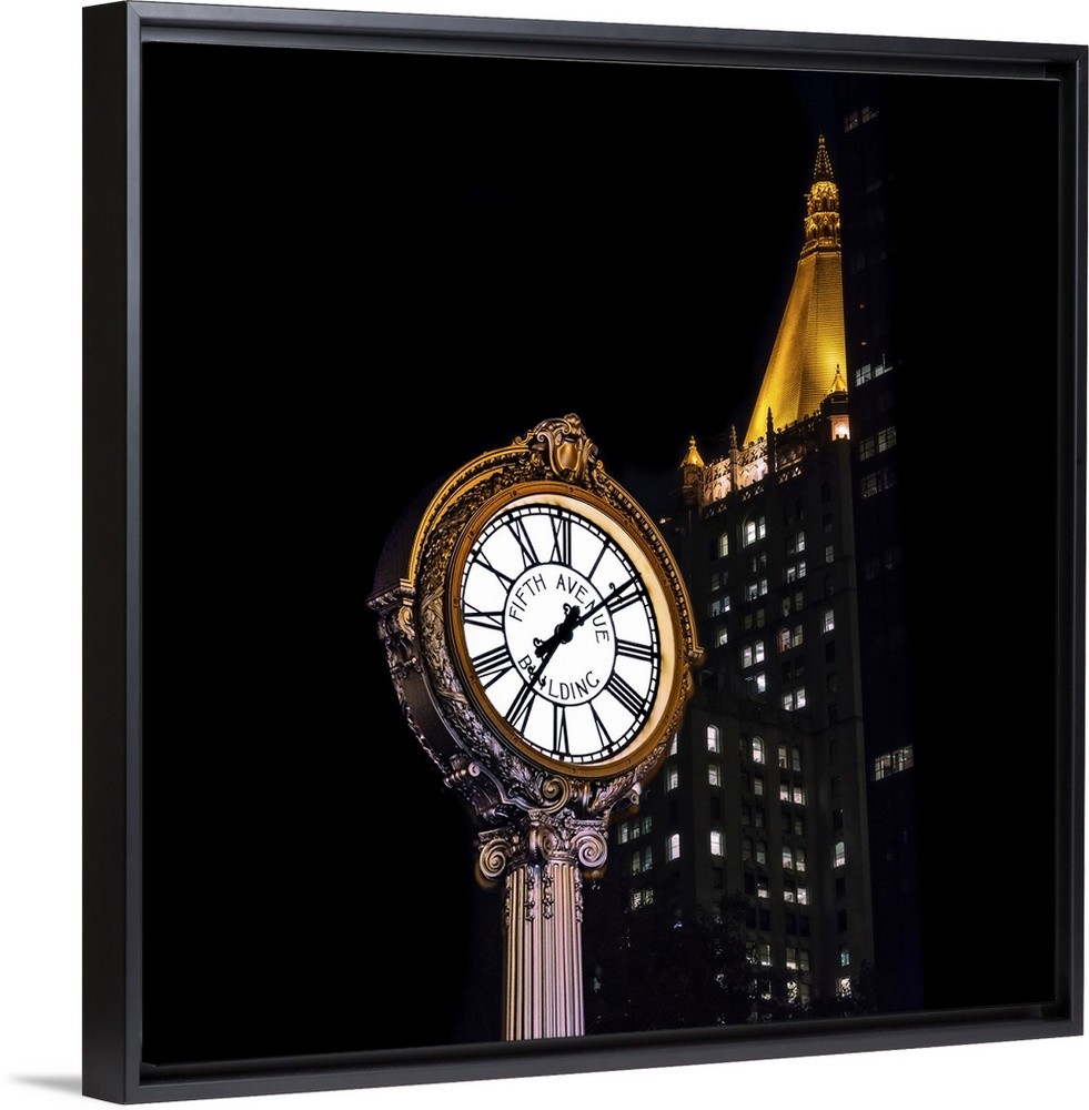 <p>On New York City Manhattan's Fifth Avenue, an ornate lit white Roman numeral clock with golden glints surrounding its face is juxtaposed against the black night sky and a gold lit roof with points of light from a lone distant building.</p>